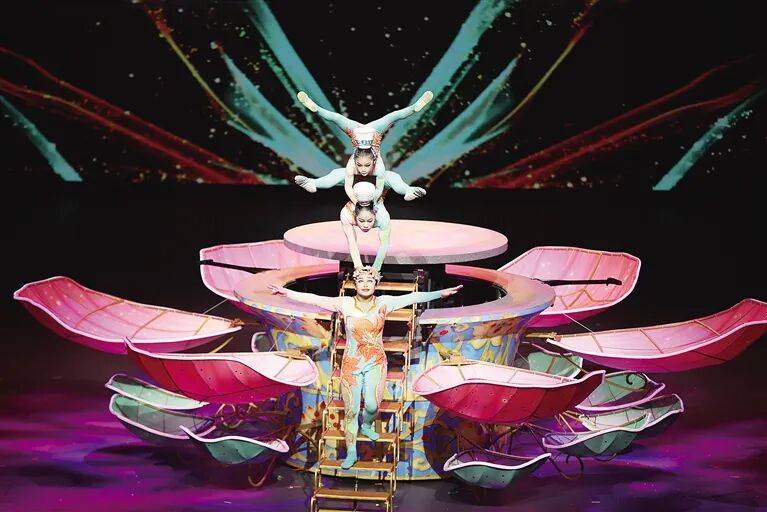表演开场,芙蓉花造型的花台上,3位演员便以高难度的对手倒立水平顶开启演出。紧接着,一系列让人眼花缭乱的技巧接连呈现:头上单手顶考验着演员们的平衡感与核心力量;旱水起单手顶在动态中彰显了身体控制的极致境界;后双滚顶与抱头卡脖顶的衔接,更是将力量与柔韧完美交融,最终形成稳定且富有张力的三人立体造型。