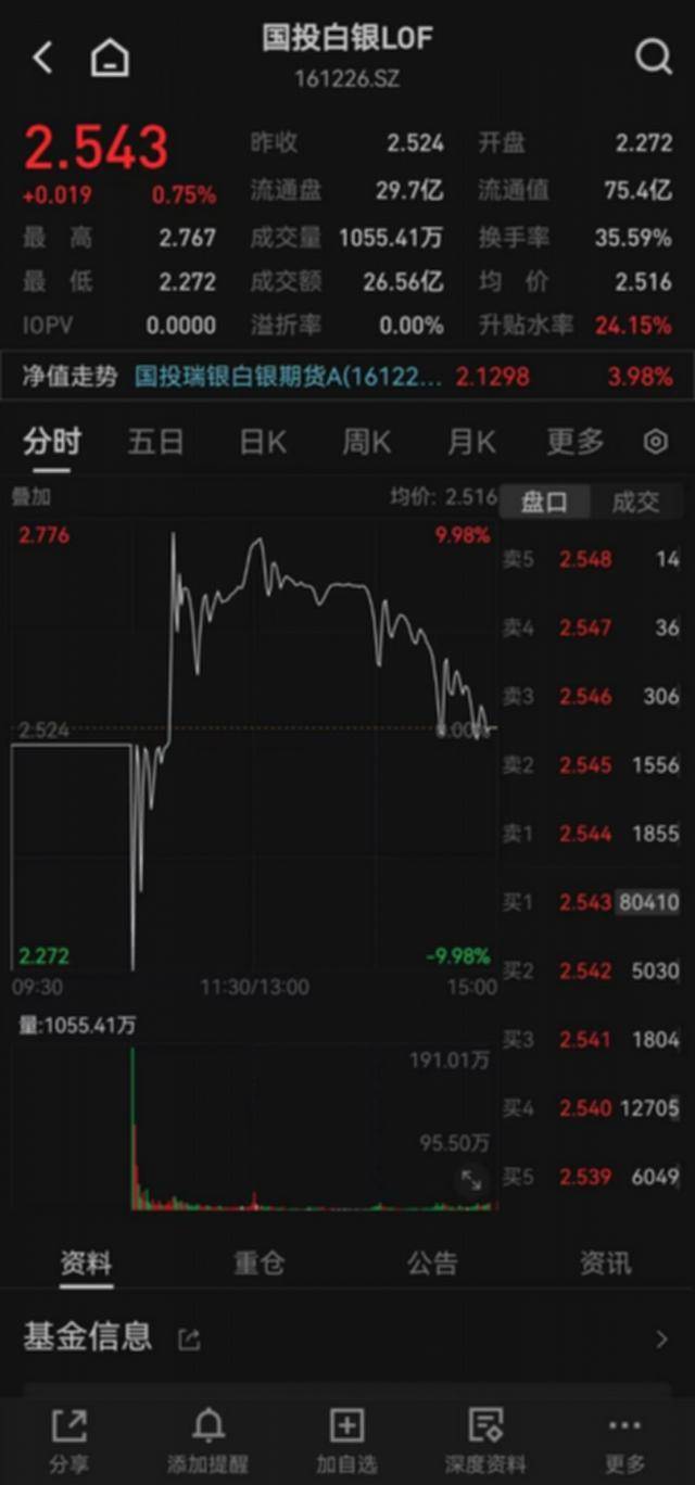在此背景下,国投白银LOF的“套利”就成了焦点。背后原因在于,这只基金有“两个价格”。一个是基金净值,相当于它的“真实身价”,由持仓的白银资产价值决定,每天收盘后公布;另一个是场内交易价,就像二手市场的炒作价,由买卖双方在交易所内竞价形成,参与者情绪越狂热,场内价格可能就越离谱。当场内价格比净值明显高出一截时,就能走“场外申购→转到证券账户→卖出”的流程赚差价,其本质就是“低买高卖”。