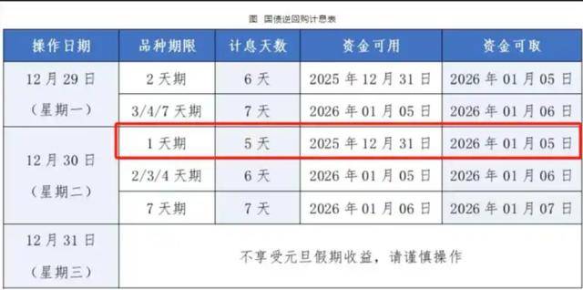 对于关注理财的投资者来说,12月30日(周二)是操作国债逆回购的黄金窗口——只需投资1天期品种,即可享受包含假期在内的5天利息,且资金在1月5日开盘前即可取出。如果是12月31日,也就是休假前一天再做逆回购,只能计算一天的利息,假期期间也不计算利息。