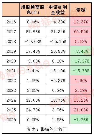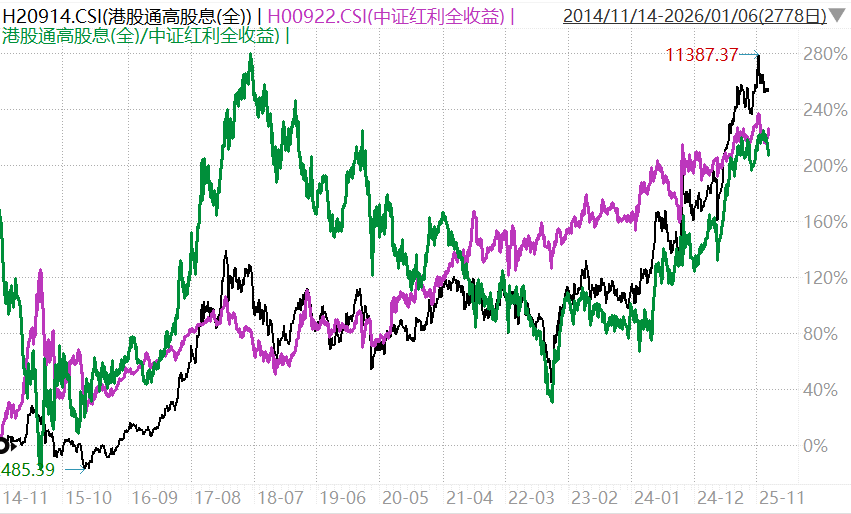 2025年底,港股通高股息的股息率是6.58%,中证红利的股息率是5.07%。考虑到港股分红要交20%的红利税,港股通高股息的实际股息率是5.26%,相较中证红利的优势很小了。