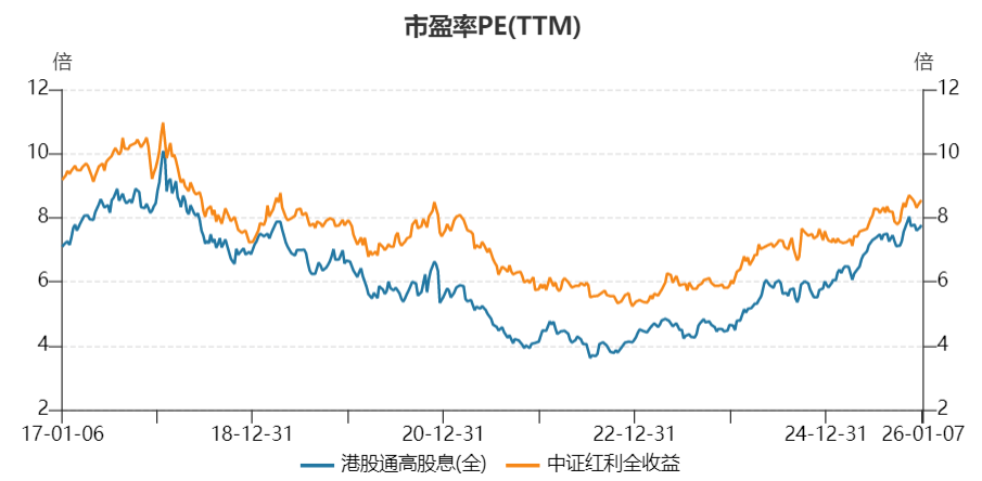 之后,2022-2025年,港股通高股息的跑赢,也是两者估值差距缩小的过程。截至2025年底,港股通高股息的PE是7.77倍,中证红利的PE是8.55倍,估值差距缩小到10%以内。