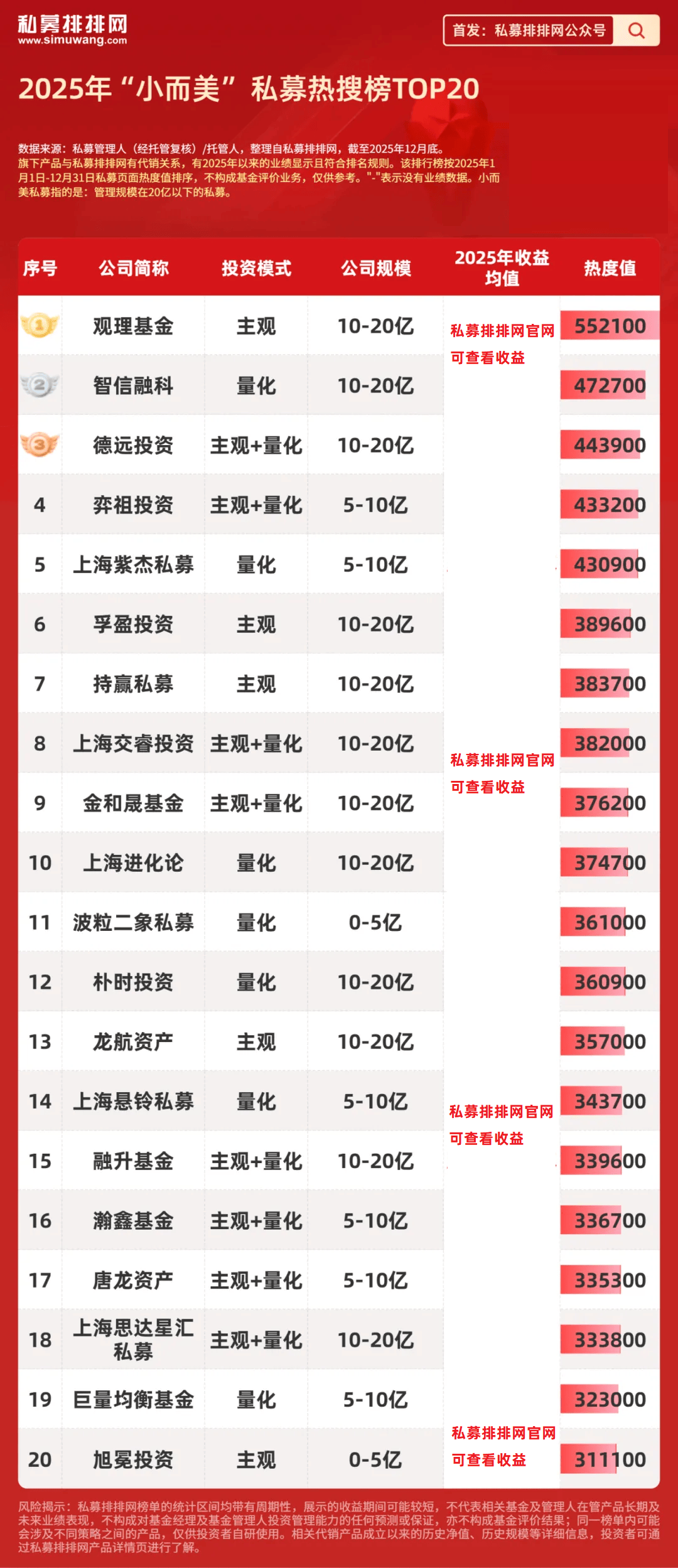 随着2025年的收官,2025年度“小而美”私募人气私募基金经理、人气私募公司以及人气私募产品也随着曝光(人气排行榜按2025年1月1日-12月31日私募页面热度值排序)