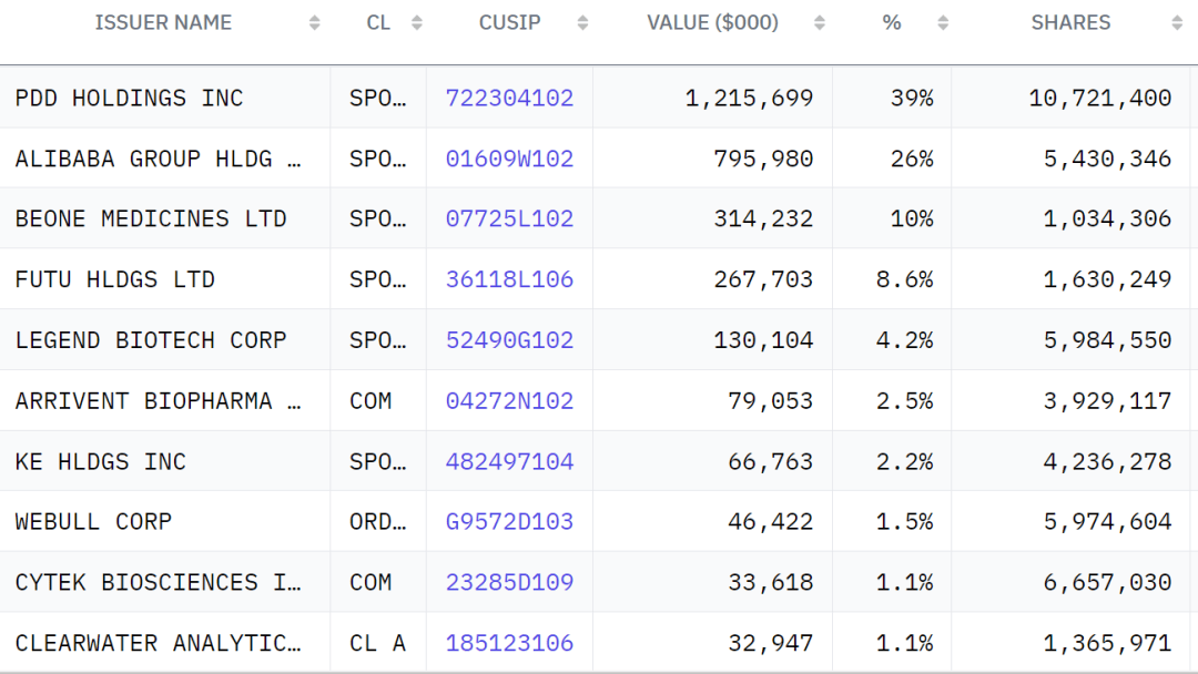 其中,拼多多(PDD)作为HHLR的第一大重仓股,本季度继续获得大幅增持,持股数量从859万股增至1072.1万股,相较于去年三季度末增持212.9万股,持仓市值由11.36亿美元升至12.16亿美元,占投资组合的比例由28%升至39%。