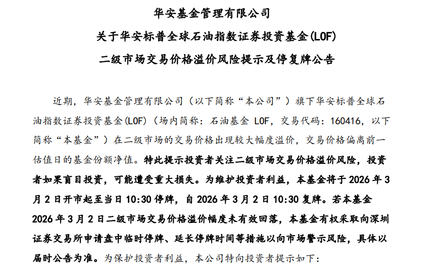 例如3月1日晚间,华安石油LOF发布溢价风险提示及停复牌公告,基金在二级市场的交易价格已出现较大幅度溢价,为维护投资者利益,基金将于2026年3月2日开市起至当日10:30停牌,自2026年3月2日10:30复牌。
