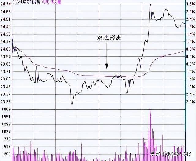 如图1-2是东方铁塔(002545)分时走势图。个股在当日的分时中走出探底回升的走势,个股在当天早盘高开后,即进入单边下跌的走势中,个股于接近午盘时探到最低点,随后股价出现震荡回升的走势。个股在午盘开盘后再次作出一个探底的动作,并未跌破前一低点,在分时上构成一个双底的走势。个股随后开始大幅的拉升走势。